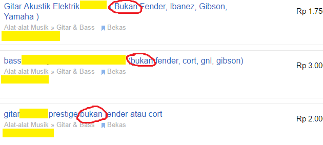 Penjelasannya, mereka jual barang A, harusnya merek cukup tulis A aja di judul entri iklannya, tapi mereka tulis “Jual barang A, bukan B, C, D, dst..”.