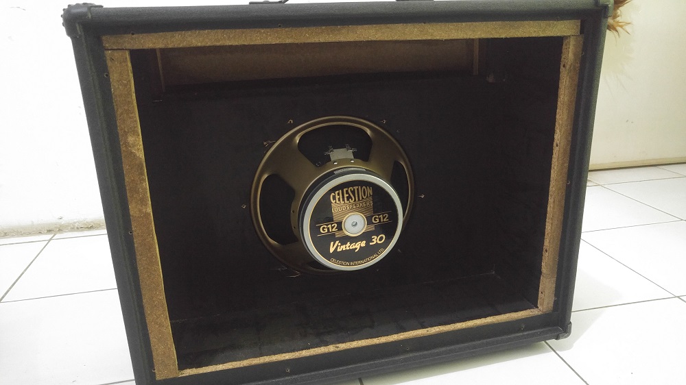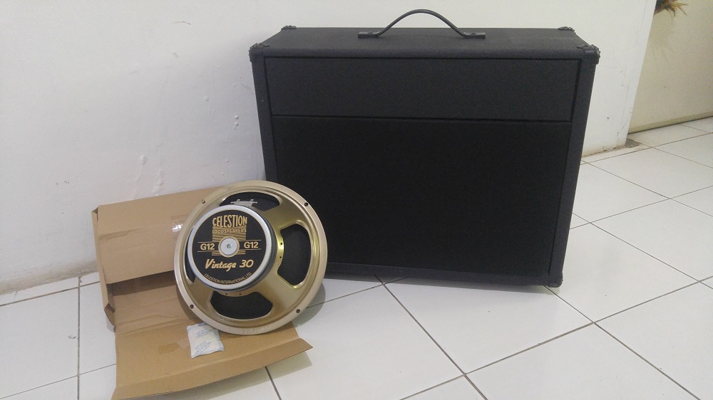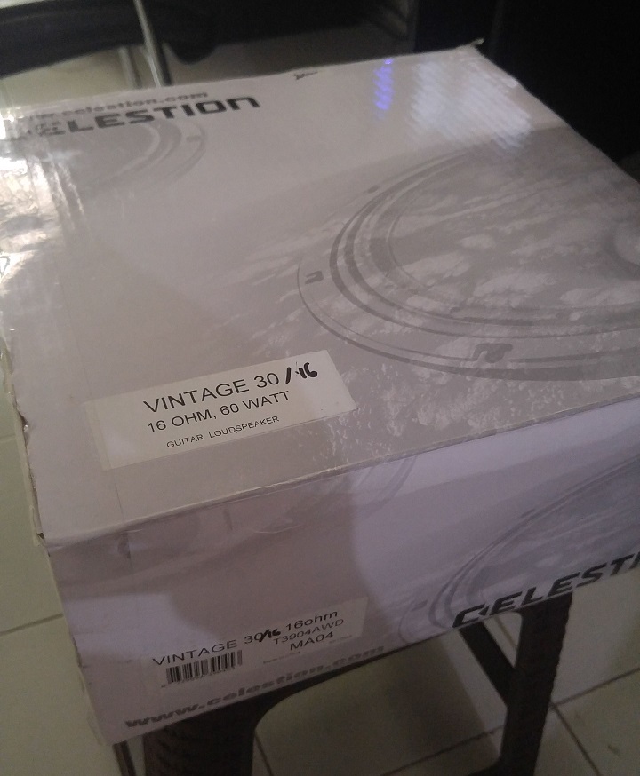 Ngomong ngomong, kenapa langsung kasih gambar aja ya? bhahaha. Jadi sebenernya barang yang gw pesen beberapa waktu lalu itu adalah Speaker Gitar Celestion Vintage 30. Ya, jadi speaker ini gw beli dengan maksud untuk menggantikan speaker “Sinar Baja” yang terpasang di kabinet 1×12 custom gw. Speaker “Sinar Baja” ini sebenernya bukan untuk cabinet gitar, tapi untuk PA, atau speaker dangdutan bahahaha.